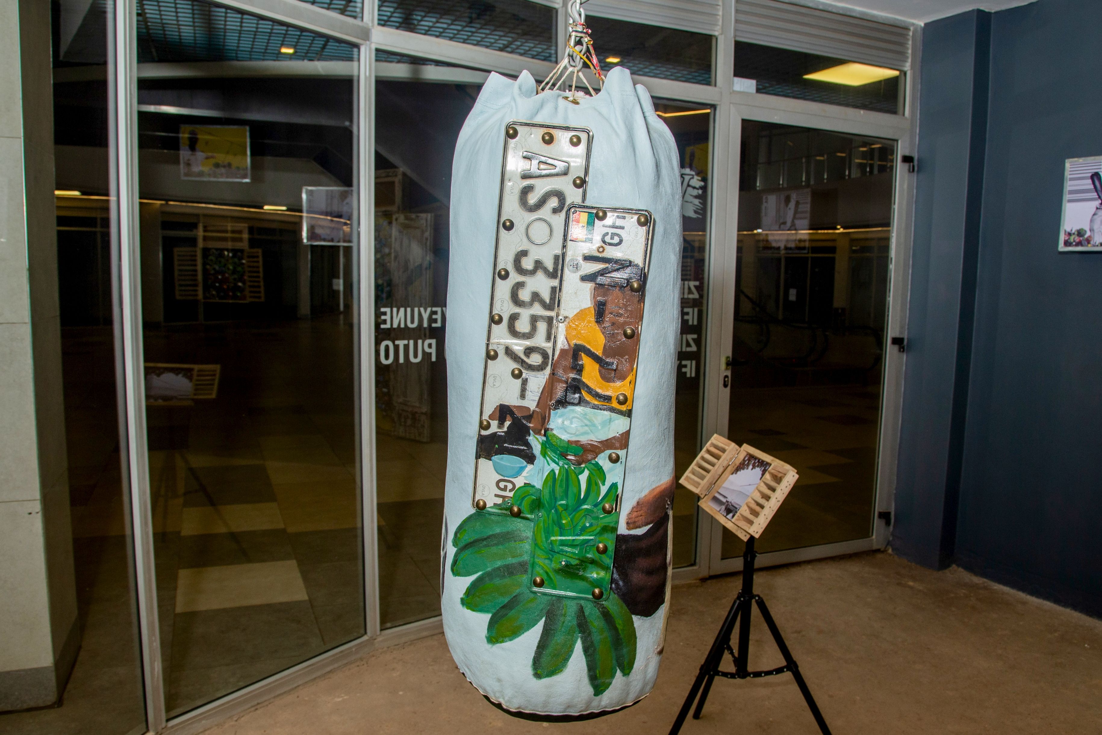 خلال نقاش في افتتاح المعرض، دخلتُ أنا وصديقٌ لي إلى تركيب كيس اللكم. يحمل العمل الفني Matooke in Kumasi امرأة تتنفس بهدوء ولطف وسكينة. هنا بيتُها. إنَ فعل تقشير الموز الأخضر يجسّد المنزل بالنسبة لها. هذه هي تحيتها، وموقعها المتقدم في سلسلة الغذاء. هنا، تمدّ الآخرين بما صنعته يداها.