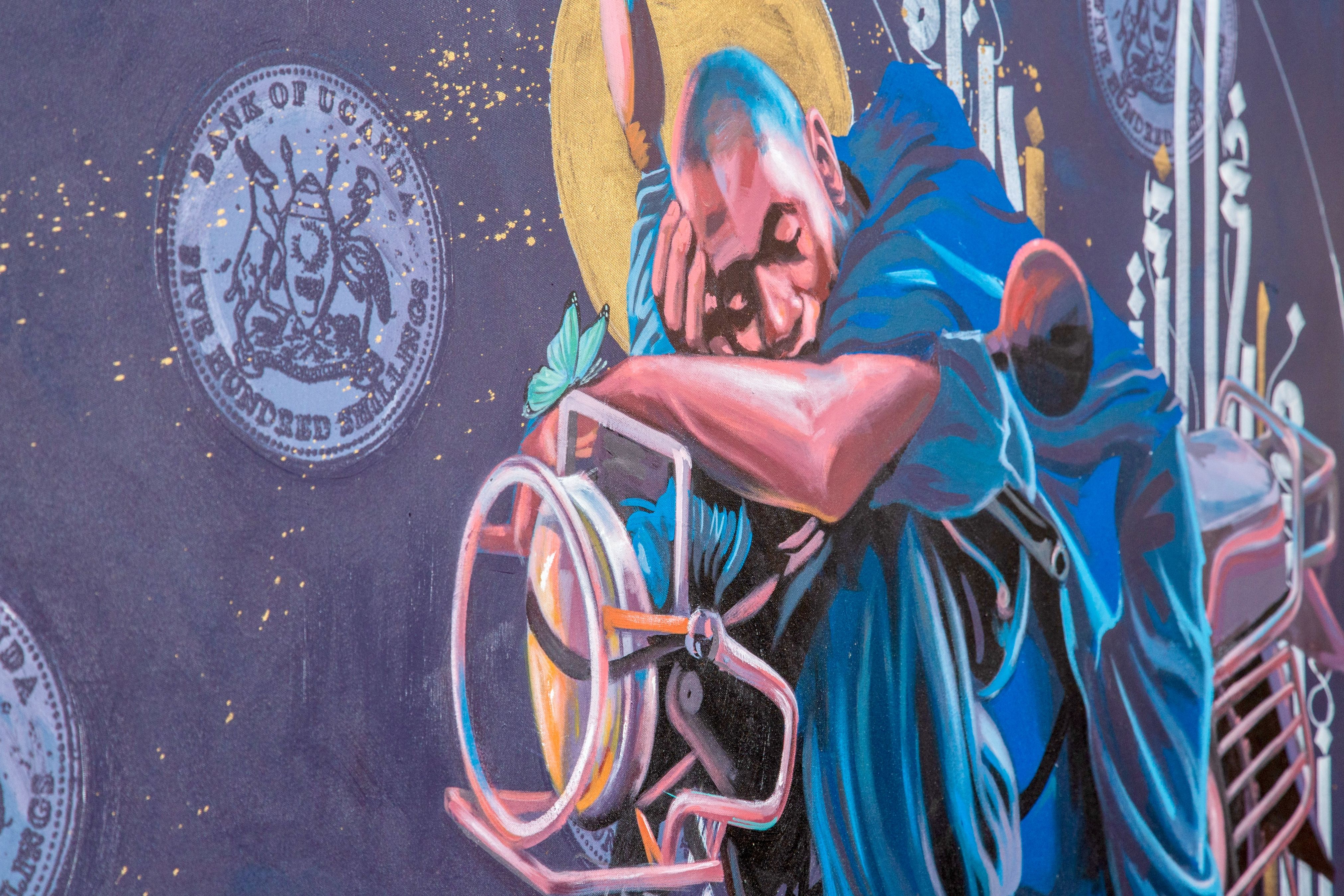 أثناء الغفوة، هناك، على يده، تستقر فراشة. تجد مكاناً ساكناً. مكاناً لتأخذ لحظة راحة، ومكاناً لتبدأ رفرفة جديدة لجناحيها. تسترح وتصلي معاً. على أمل أن تتناثر حين تقلع الفراشة، براعم النقود للعامل المجتهد.