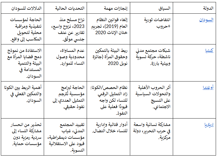المصادر: تم إعداد هذا الجدول اعتماداً على تقارير ومنشورات ودراسات موثوقة حول حقوق النساء في السودان، إريتريا، أوغندا وكينيا (2017–2024).