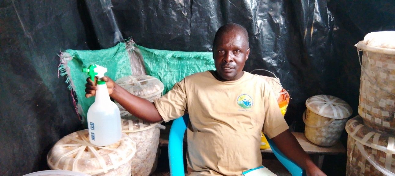 Emmanuel Chaka, Chairman Muungano Farmers Group in Mariakani, Kilifi County, showcasing how mushrooms are grown. Photo Courtesy Teryani Mwadzaya.