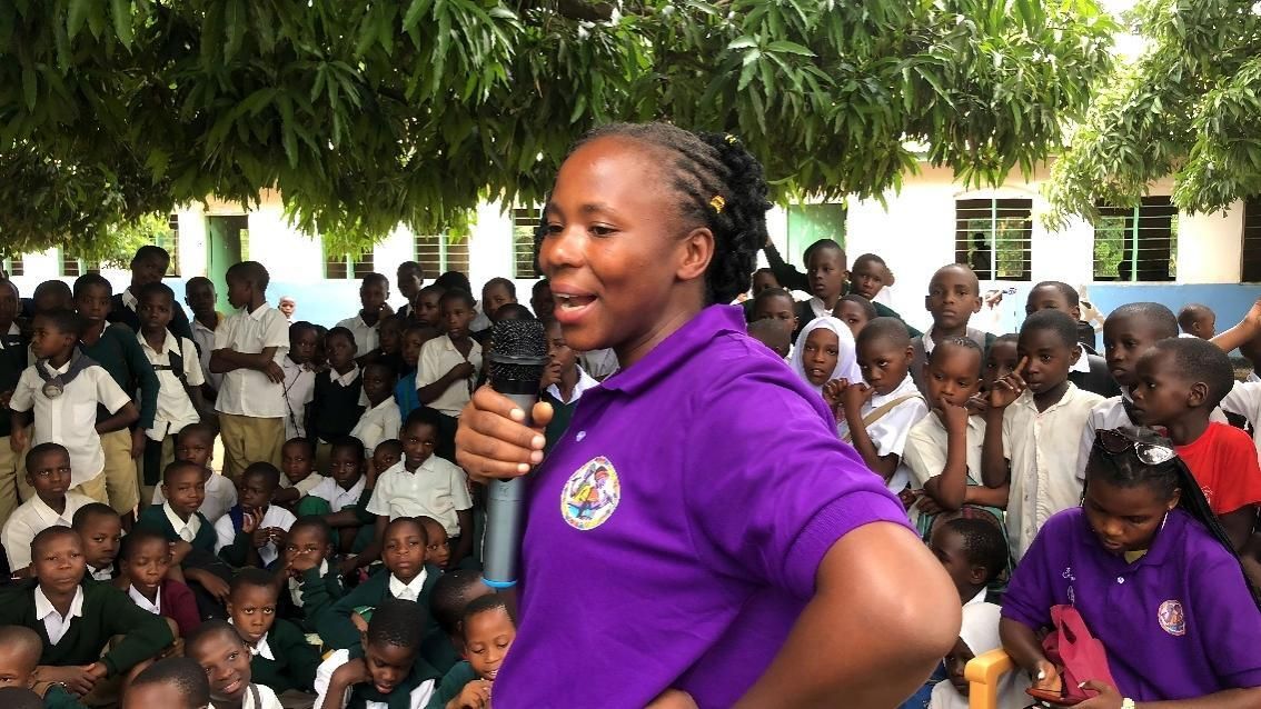 Speaking to pupils at Kisesa Primary School in a tailored session on self-awareness and respect. Photo by Philipo Florian.