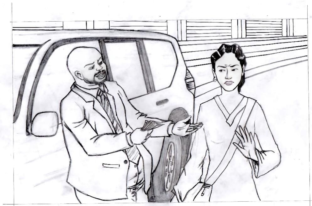 Artwork depicting a man attempting to lure a young girl with money; highlighting economic vulnerability and the need for awareness. Drawing by Ammuly Ramadhan, AICT Bujora Center.