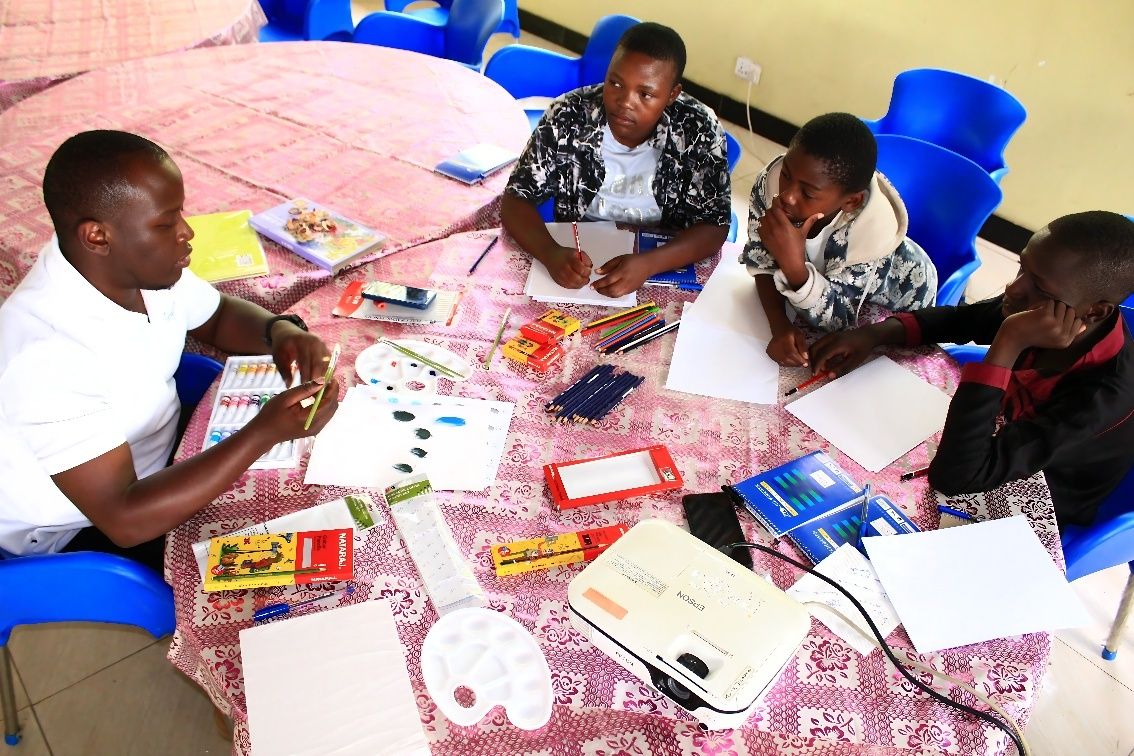 Under the guidance of the author as an art instructor, young artists learn to channel their SRHR knowledge into powerful paintings and drawings. Photo by Peter Salawe, AICT Bujora Center