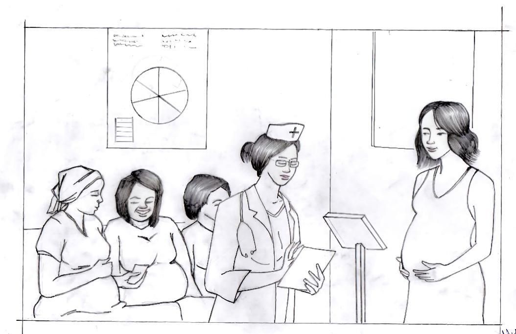 A painting urging women to attend health clinics on time, part of the awareness artworks produced during the challenge. Drawing by Ammuly Ramadhan, AICT Bujora Center