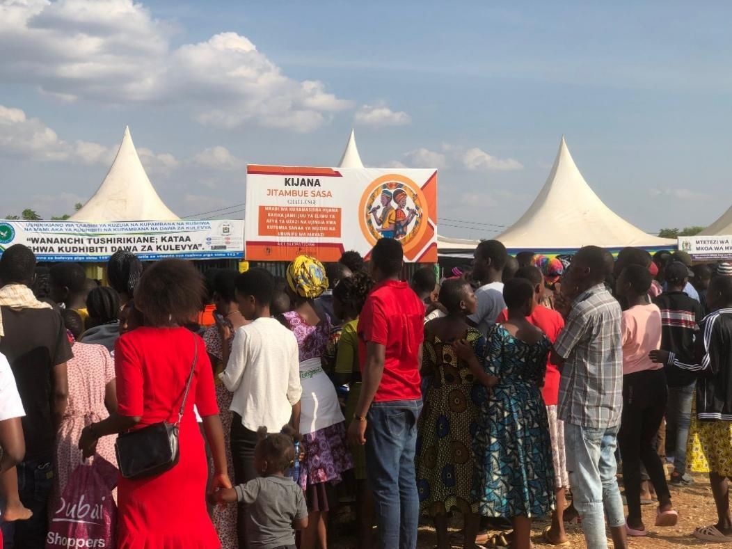 At the Bulabo cultural event in Kisesa, the team used their booth to introduce the project and hear directly from parents and community members. The Kijana Jitambue Sasa banner is visible at the centre of the outreach space. Photo by Philipo Florian, AICT Bujora.