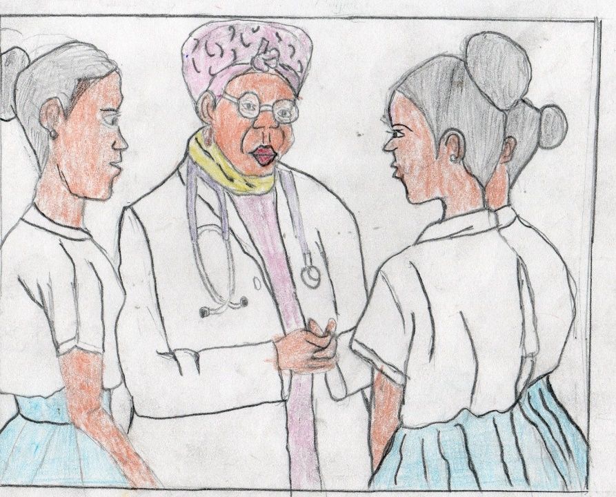 The drawing showing the girls at the clinic getting the correct information on SRHR from the doctor. Kijana Jitambue Sasa Project.